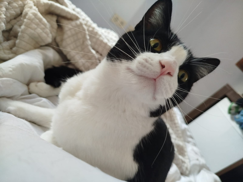 Oye es muy sociable, con cualquier cosa. Le gustan los perros. También es posesivo, y muy cariñoso. Ha tenido comportamiento de marcaje, pero va mejorando. Es importante no dejar ropa en el suelo por eso. Necesita contacto físico, lo primero que hago al entrar en casa es estirarle las patitas, y amasa mi cuello con ganas!! 馃挒馃挒馃挒