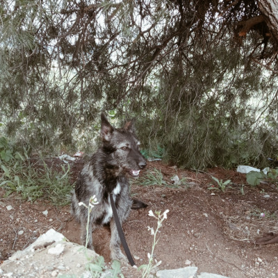 Una buena persona encontró a Tilo solito en el pantano de Cubillas, se estuvo acercando a varias personas y se quedó al lado de su furgoneta tumbado y muy pendiente de ella. Luego la seguía andando a donde ella fuese.