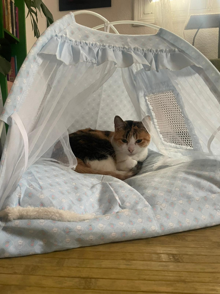 Por su carácter pensamos que debió ser abandonada allí, es cariñosa, pero tímida. Por lo demás es una gata familiar, compatible con otros gatos y con niños.