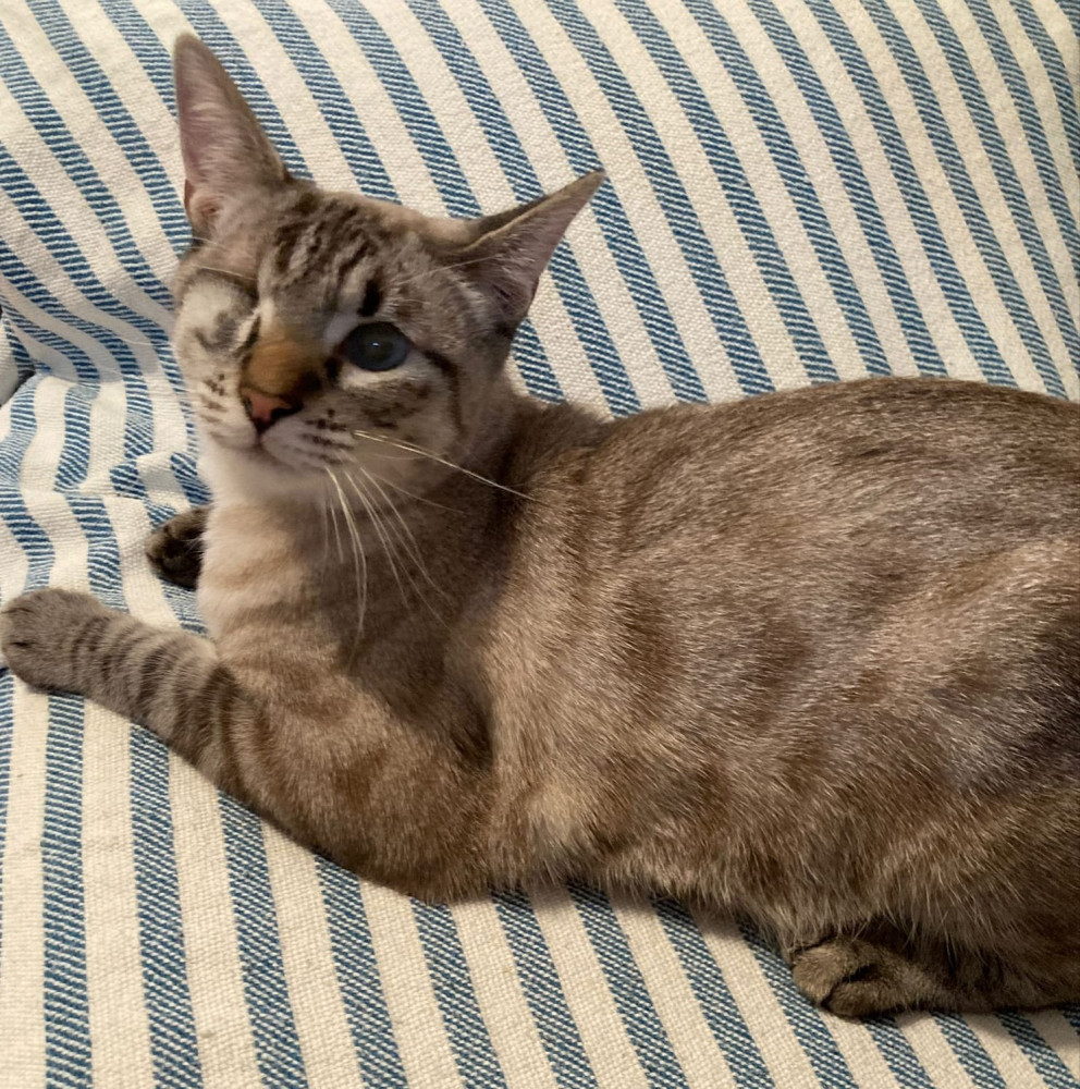 Algodón apareció junto a sus hermanos Merlín y Morgana en una colonia que controlamos, en el barrio del Sacromonte. Tenía una herida grave en un ojo que finalmente terminó perdiendo, pero no le afecta para nada en su vida diaria. Es un gato alegre y feliz.