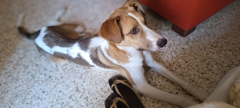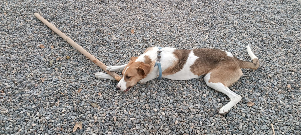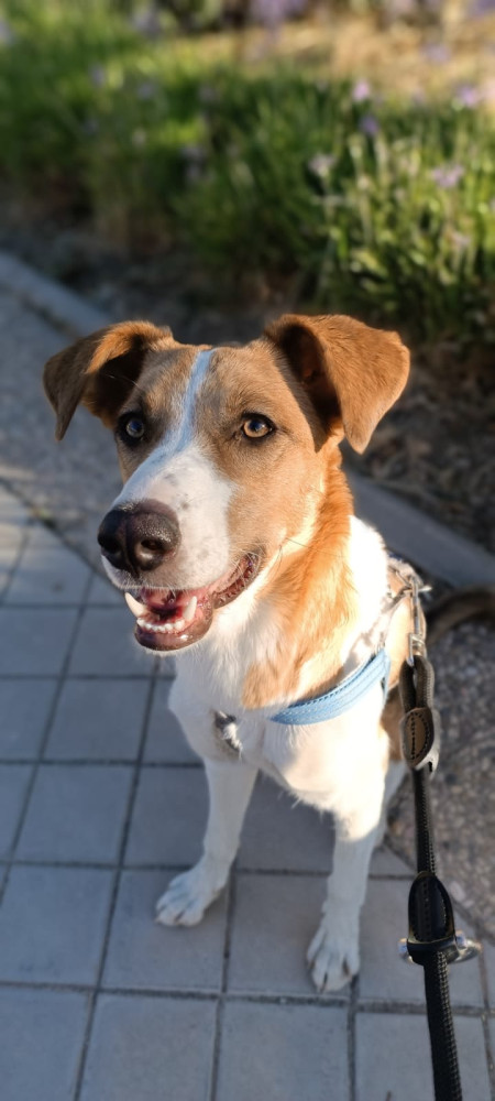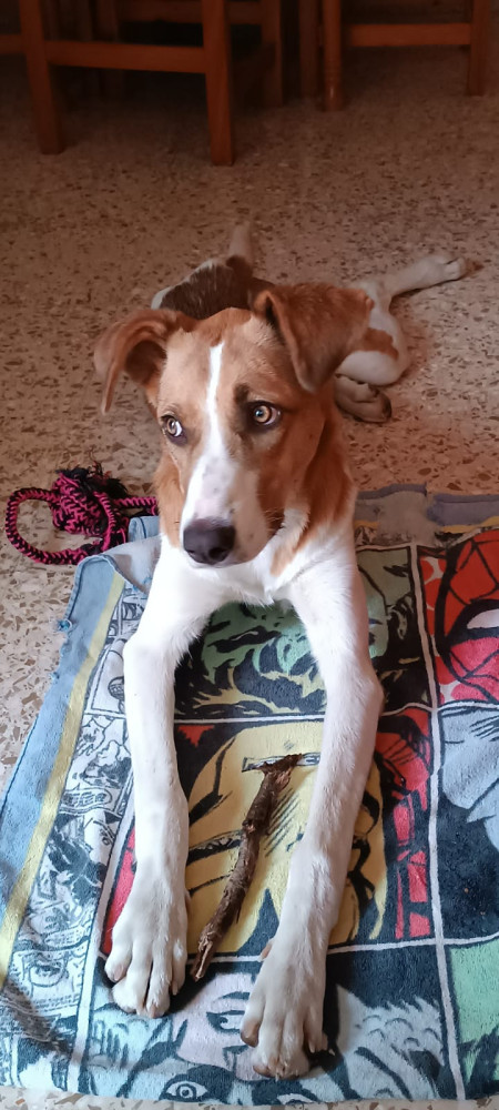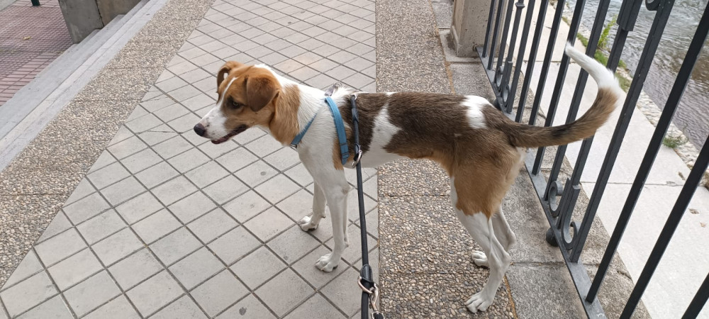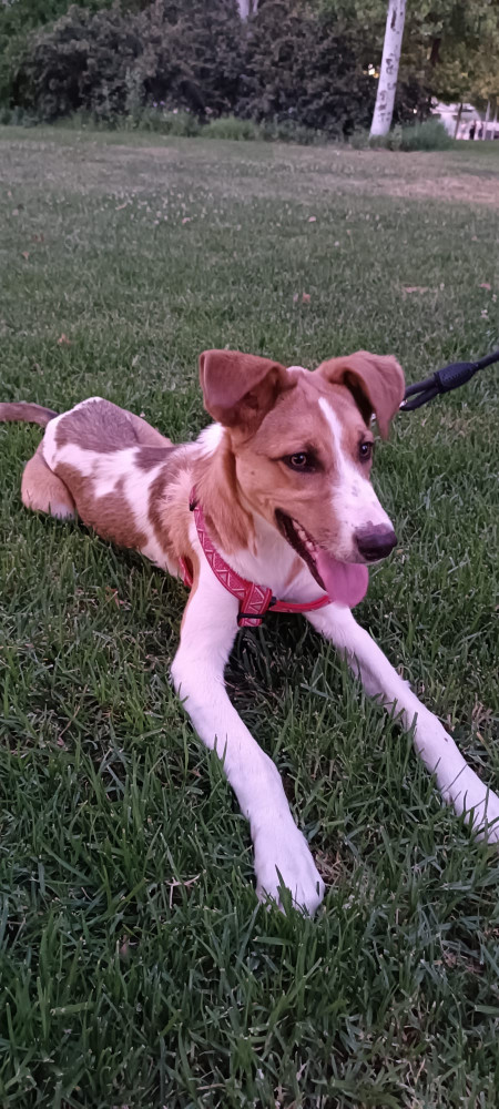 Kira es una cachorrita grande cruce con podenco muy sociable tanto con perros como gatos y humanos. Se lleva bien con todo el mundo. En el parque de perros se hace amiga de todos y le gusta saludar a todos los perros y humanos que entran. Con la correa se porta un poco mal porque ladra a los otros perros para que jueguen con ella. Quitando eso, no tiene ningún otro problema durante los paseos. Es muy curiosa y quiere olerlo todo. Se relaciona bien con gatos. Se acerca a ellos con cuidado y no les ladra.