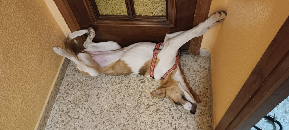 Es muy cariñosa y le gusta que juegues con ella pero también le gusta mucho jugar con otros perros o incluso jugar sola. Después de los paseos se echa una buena siesta en casa.